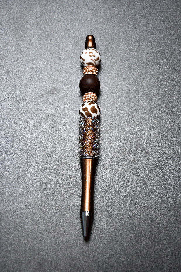 A trendy cowprint pen with brown glitter accents for a bold and playful look.