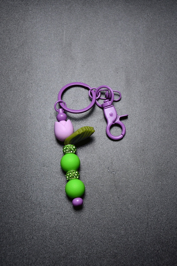 A detailed purple rose keychain with leaf accents for extra charm and style.